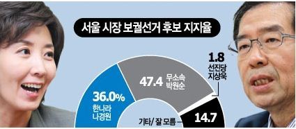 하지만 이번 선거는 나 후보에게 절대적으로 불리하다. 오세훈의 파행을 그대로 안고 선거를 치러야 하는 데다가 야권단일후보와 맞서야 한다. 여론조사에서도 박원순 후보에게 크게 밀린다. 객관적으로 보면 나 후보의 승리를 장담할 수 있는 구석이 전혀 없다.