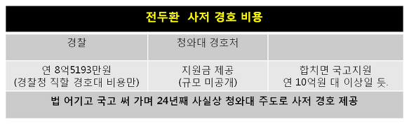 전두환 경호에 들어가는 경찰 예산은 연 8억 5000만 원. 반란과 내란의 ‘동지’였던 노태우 사저 경호에도 매년 7억 2000만 원을 쓰고 있다. 경찰 예산뿐 아니라 청와대 경호처의 지원금도 있어 실제로는 이보다 훨씬 많다.