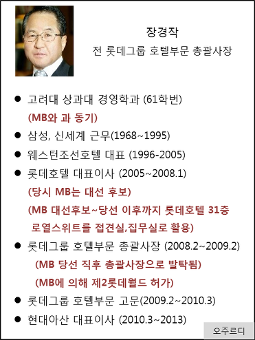 장경작이 당시 롯데호텔 사장이었다. 자신의 과 동기가 대통령에 출마하자, 최고급 룸을 내어주며 친분을 과시하려 했던 모양이다. 당선은 따 놓은 당상인 유력 후보를 자신의 호텔에서 모셨던 장경작. 그는 MB의 대통령 취임과 거의 동시에 파격적인 승진을 한다. 신격호는 그를 호텔사업과 면세사업, 롯데월드사업부까지 아우르는 초대 총괄사장에 임명했다. 없었던 자리까지 만들어 MB의 절친을 우대한 이유가 뭘까?