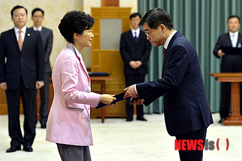 【서울=뉴시스】김영욱 기자 = 박근혜 대통령이 4일 오후 청와대에서 열린 퇴임대법관 서훈 및 신임대법관 임명장 수여식에서 조희대 신임 대법관에게 임명장을 수여하고 있다. 2014.03.04. mirage@newsis.com