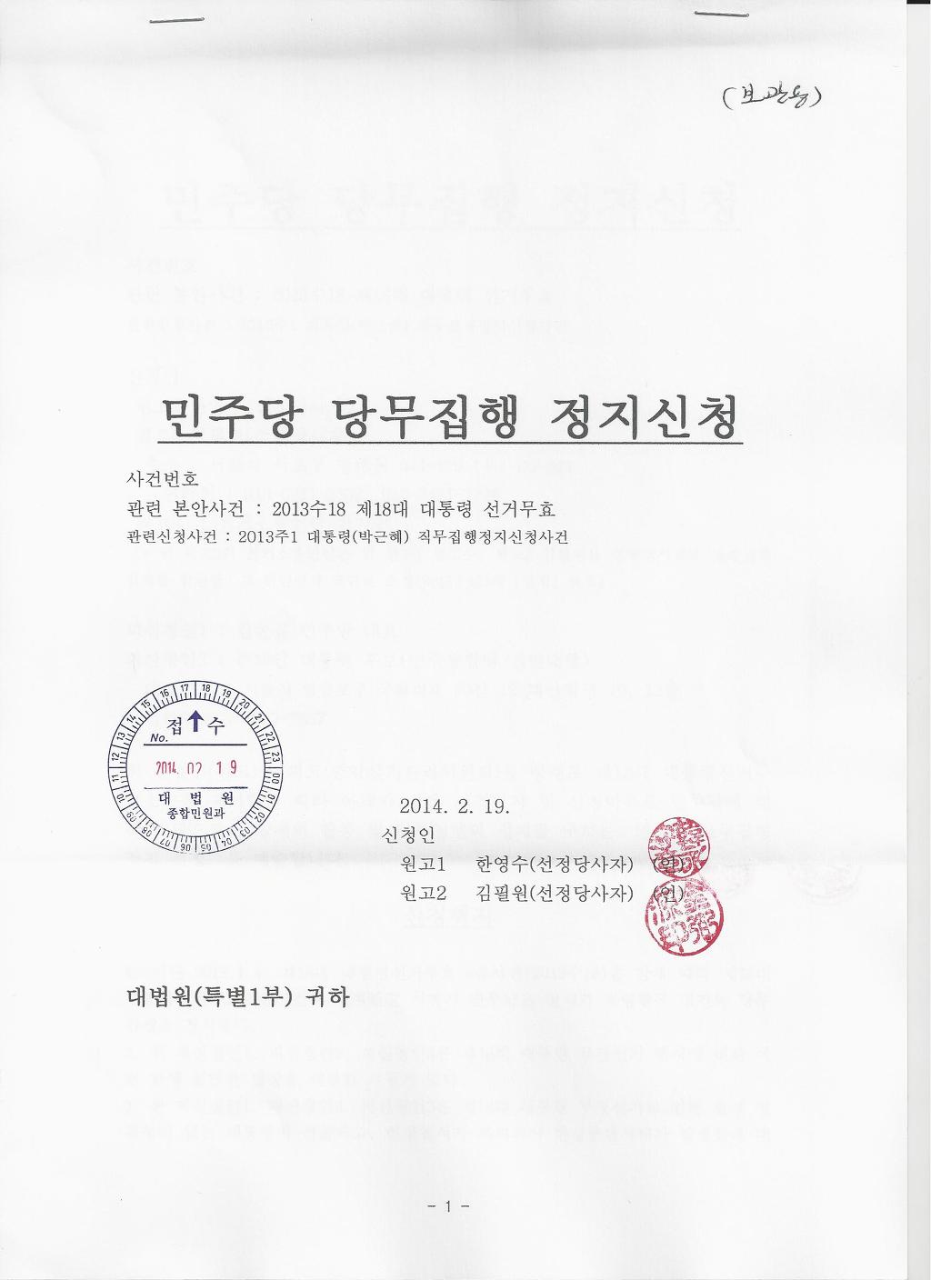 1. 지난 2013.1.4. 제18대 대통령선거무효소송사건(2013수18)을 함에 따라 제18대 대통령선거무효소송사건의 확정판결 시까지 민주당은 일체의 정당활동 정지와 당무집행을 정지한다.