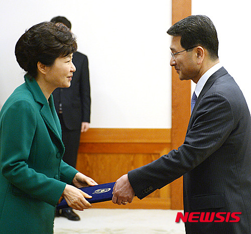 【서울=뉴시스】박주성 기자 = 박근혜 대통령이 8일 오후 청와대에서 박상옥 신임 대법관에게 임명장을 수여하고 있다. 2015.05.08. park7691@newsis.com