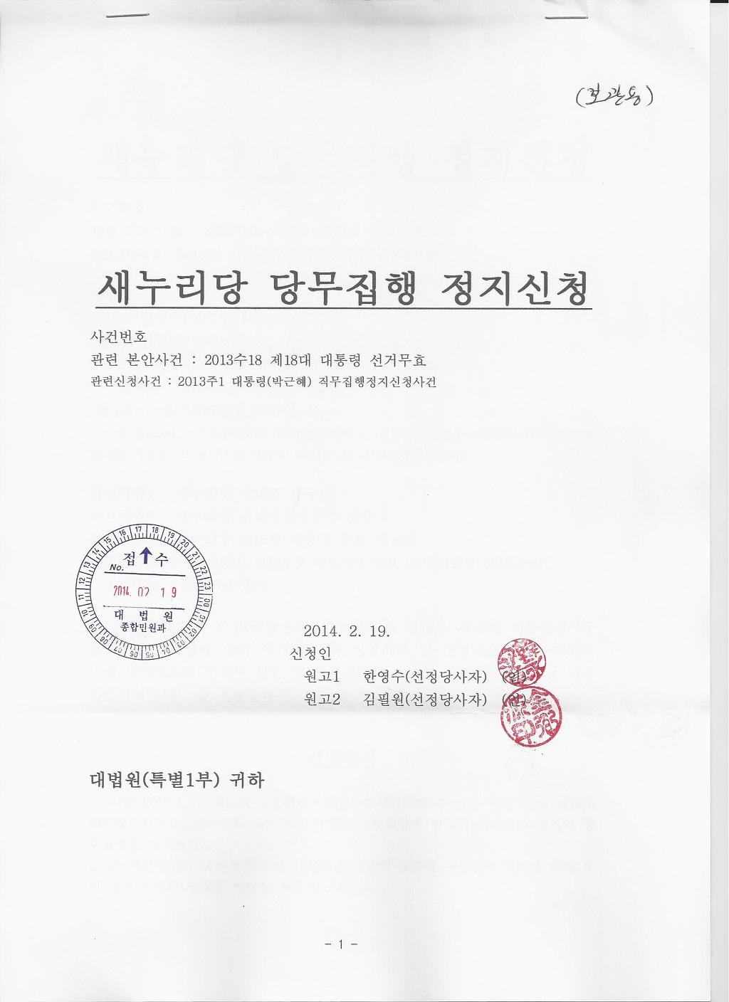 1. 지난 2013.1.4. 제18대 대통령선거무효소송사건(2013수18)을 함에 따라 제18대 대통령선거무효소송사건의 확정판결 시까지 새정치연합은 일체의 정당활동 정지와 당무집행을 정지한다.