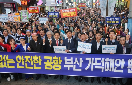 참석자들도 "깜깜이 용역 NO NO", "삼면 바다 놔두고 산 중턱에 공항은 안 된다"라고 적힌 피켓을 들고 가덕도 유치를 외쳤다.