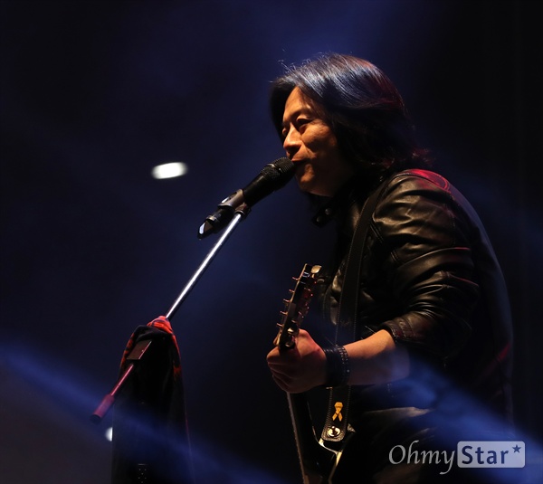 그는 다음 노래로 넘어갈 때마다 윗옷을 하나씩 벗었다. 가죽 재킷을 벗었고 다음엔 티셔츠를 벗었다. 결국, 한겨울에 반팔티 하나를 입고 뜨겁게 노래했다. 군복 느낌의 독특한 바지에 눈길이 갔다. 유심히 봤더니 '이게 나라냐'고 적힌 천이 한 땀 한 땀 바지에 꿰매져 있었다. 단독콘서트도 아닌 이 무대를 위해 의상까지 맞춤으로 준비해온 이승환, 참 대단하다. '단독전쟁'을 부를 땐 모자를 쓰고 부르는 등 곡마다 다른 의상으로 다양한 모습을 보여주는 노력에 그의 마음이 담겨 있었다.