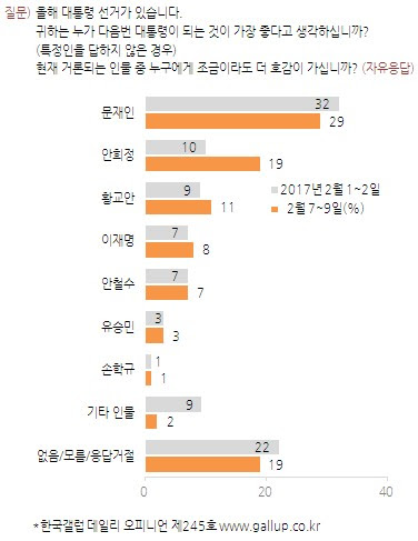 10일 <한국갤럽>에 따르면, 7~9일 사흘간 전국 성인 1천7명에게 누가 다음번 대통령이 되는 것이 가장 좋다고 생각하는지 물은 결과, 문재인 더불어민주당 상임고문(29%), 안희정 충남도지사(19%), 황교안 국무총리(11%), 이재명 성남시장(8%), 안철수 의원(7%), 유승민 의원(3%), 손학규 전 의원(1%) 순으로 응답됐고 2%는 기타 인물, 19%는 의견을 유보했다.