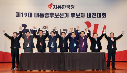 한국당은 이날 오후 여의도 63빌딩에서 김관용·김진·김진태·신용한·안상수·원유철·이인제·조경태·홍준표(가나다 순) 등 경선 후보 9명이 참석한 가운데 '제19대 대선 경선 후보자 비전대회'를 개최했다.
