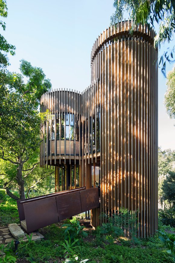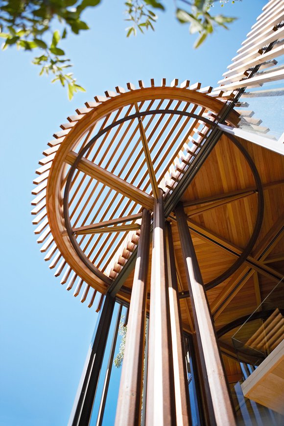 숲 속에서 자연을 즐기기에 최적화된 이 집은 시야가 탁 트인 대지 위에 주변 경관을 고려해 만든 현대적인 건축물로 기존의 목조 주택에 대한 고정관념을 깨고 강철 구조 위에 4개의 원통형 타워 모양으로 디자인된 외형이 시선을 모은다.
