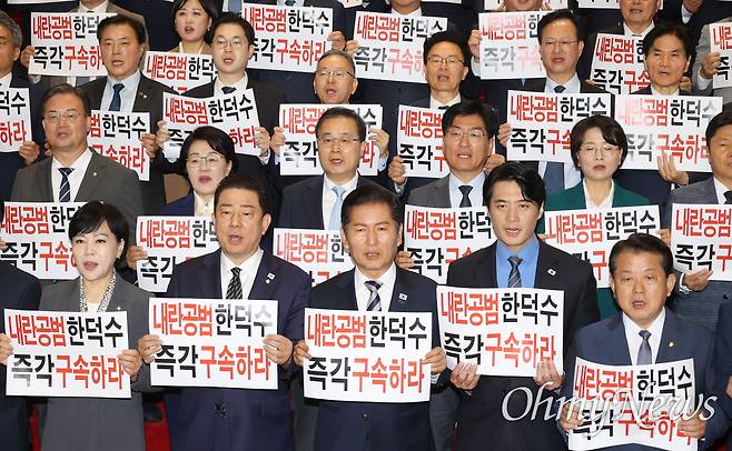 | ▲ 더불어민주당 정청래 대표와 김병기 원내대표 등 의원들이 14일 오전 서울 여의도 국회 로텐더홀에서 한덕수 전 국무총리 등 국무위원 내란 공모 기자회견을 열고 "내란공모 들통났다"며 "내란공모 들통난 윤석열 내란세력 즉각 처벌하라"고 구호를 외치고 있다. |