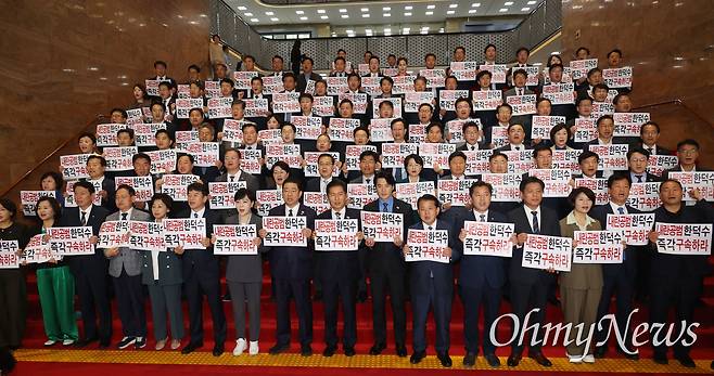 민주당 의원들 100여 명, 국회 로텐더홀 기자회견... "한덕수 끝까지 거짓말, 대선 후보까지 넘봐"