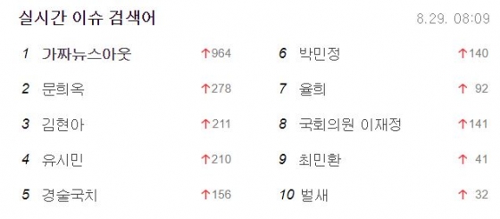 29일 오전 8시 기준 포털 사이트 다음의 실시간 검색어 1위는 '가짜뉴스아웃'다. 다른 포털 사이트 네이버에서도 이 문구는 실시간 검색어 6위에 올라와있다.