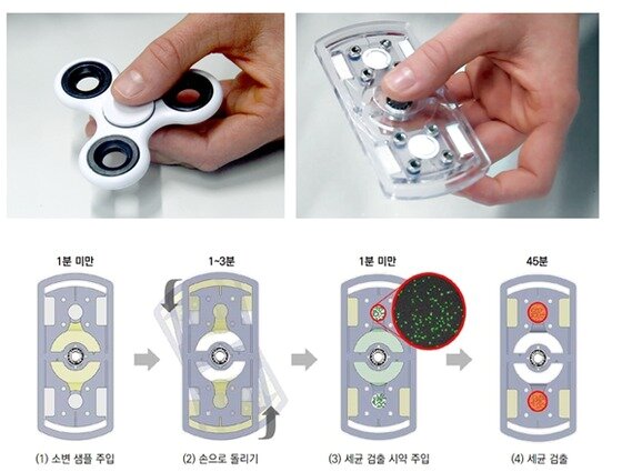 연구진은 적은 힘으로도 빠르게 오랫동안 회전하는 '피젯 스피너' 장난감에 착안해 손으로 돌리는 미세유체칩을 구상했다. 피젯 스피너는 마찰이 작은 축(베어링)을 중심으로 돌아가게 설계된 간단한 장난감으로 한 번 돌리면 수 분까지 돌아간다.