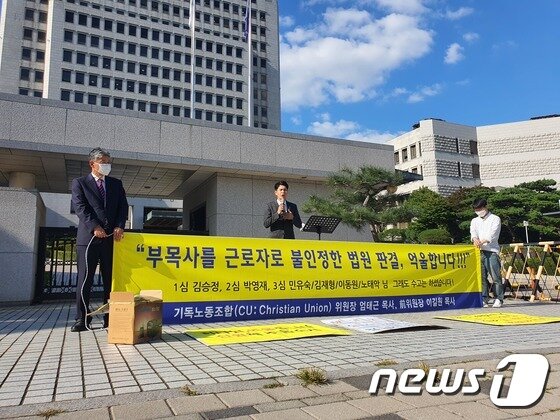 기독노동조합은 22일 오후 서울 서초구 대법원 앞에서 부목사를 노동자로 인정하지 않은 법원을 규탄하는 기자회견을 열고 노동조합의 출범사실을 알렸다.